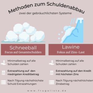 Es lässt sich zusammenfassend sagen, dass sowohl die Schneeballmethode als auch die Avalanchenmethode ihre Vor- und Nachteile haben. Es kommt darauf an, welche Methode besser zur eigenen finanziellen Situation passt. Wenn man viele kleine Schulden hat und sich schnell Erfolgserlebnisse wünscht, ist die Schneeballmethode empfehlenswert. Wenn man größere Schulden hat und langfristig denkt, kann die Avalanchenmethode sinnvoller sein. Ich persönlich bevorzuge die Lawinen-Methode, weil ich nicht unnötig viele Zinsen zurück zahlen wollte. Es war aber wirklich hart, weil man oft das Gefühl hat, auf der Stelle zu treten. Da am Ball zu bleiben war schwierig für mich, hat sich aber ausgezahlt.